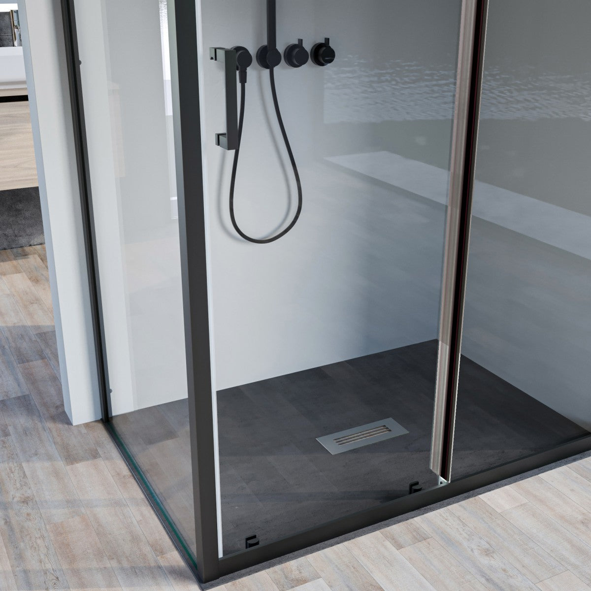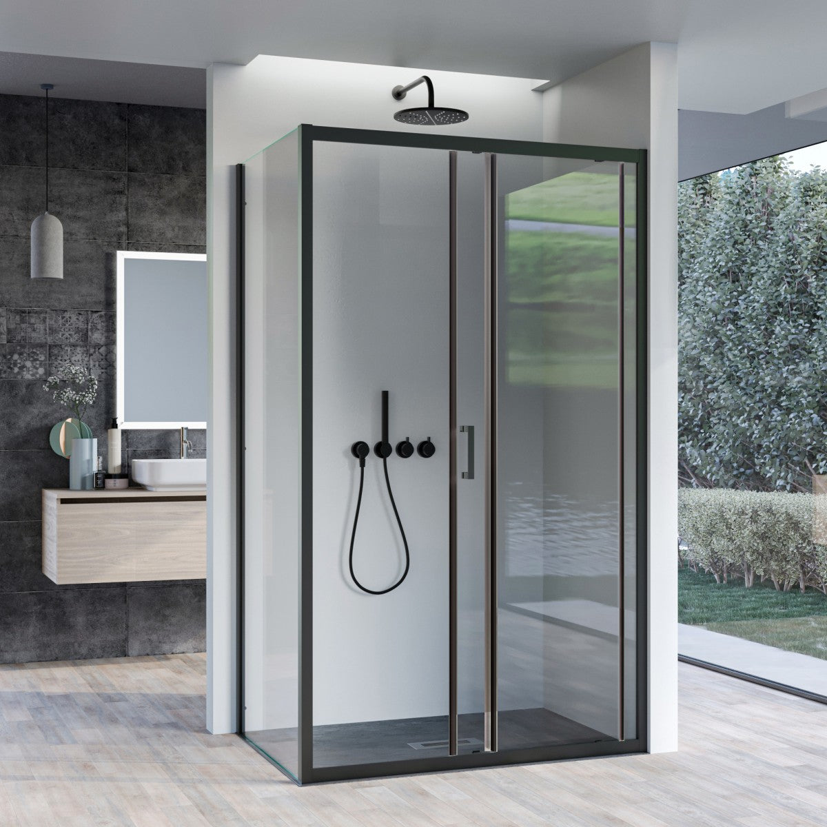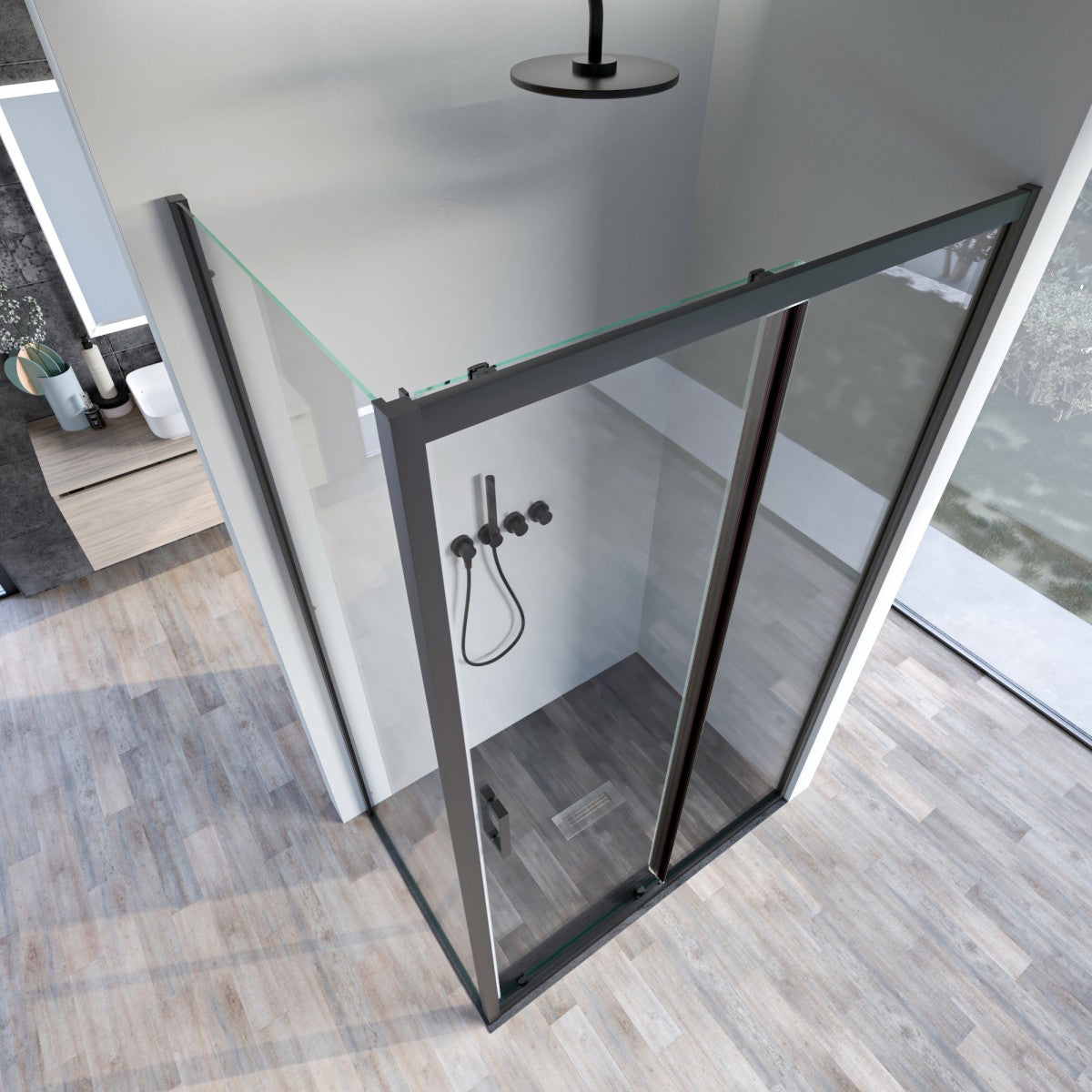 Box doccia nero a due lati con fisso e porta scorrevole alta 195 con trattamento anti calcare. Forte e robusta è la struttura che compone la porta. Il vetro scorrevole è accessoriato da guarnizioni in silicone nero ed inoltre la maniglia risulterà molto pratica e poco ingombrante. Sia la maniglia che i 16 cuscinetti sono in solido acciaio verniciato nero che garantirà la durata nel tempo del prodotto