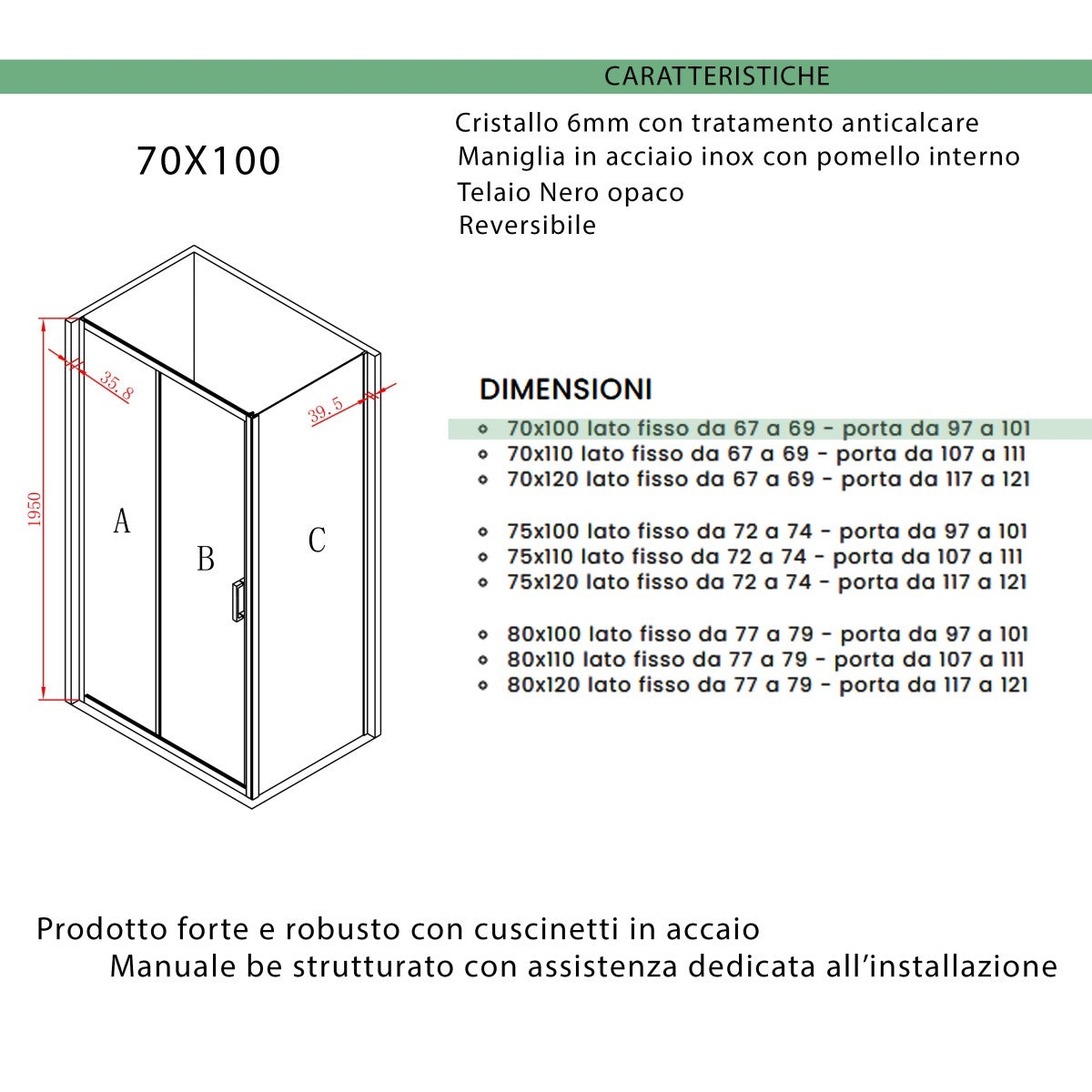 Box doccia nero a due lati con fisso e porta scorrevolealta 195 con trattamento anti calcare. Forte e robusta è la struttura che compone la porta. Il vetro scorrevole è accessoriato da guarnizioni in silicone nero ed inoltre la maniglia risulterà molto pratica e poco ingombrante. Sia la maniglia che i 16 cuscinetti sono in solido acciaio verniciato nero che garantirà la durata nel tempo del prodotto